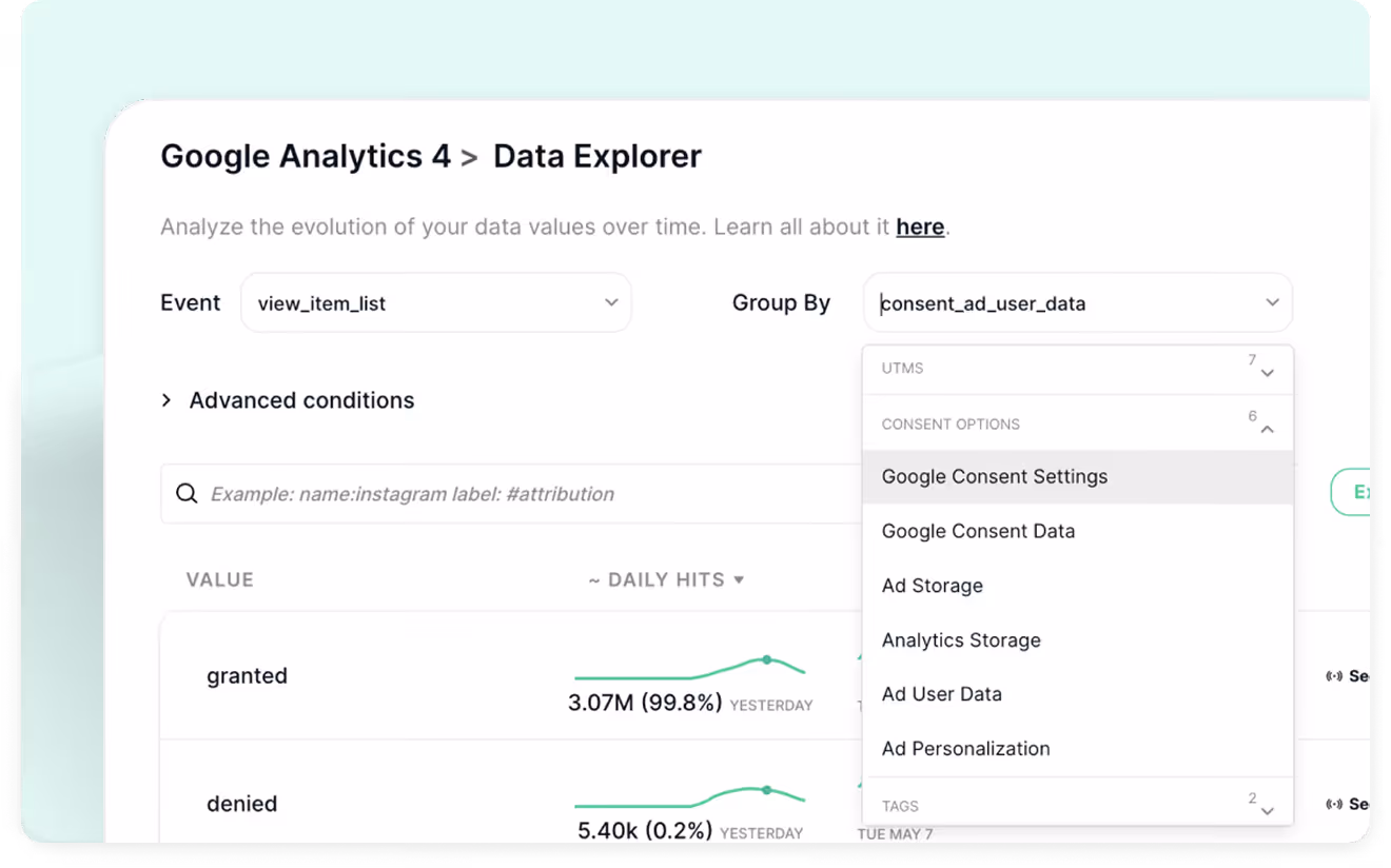- Consent funnels: Use Data Explorer to segment traffic by consent state and quantify opt-in drop-off.