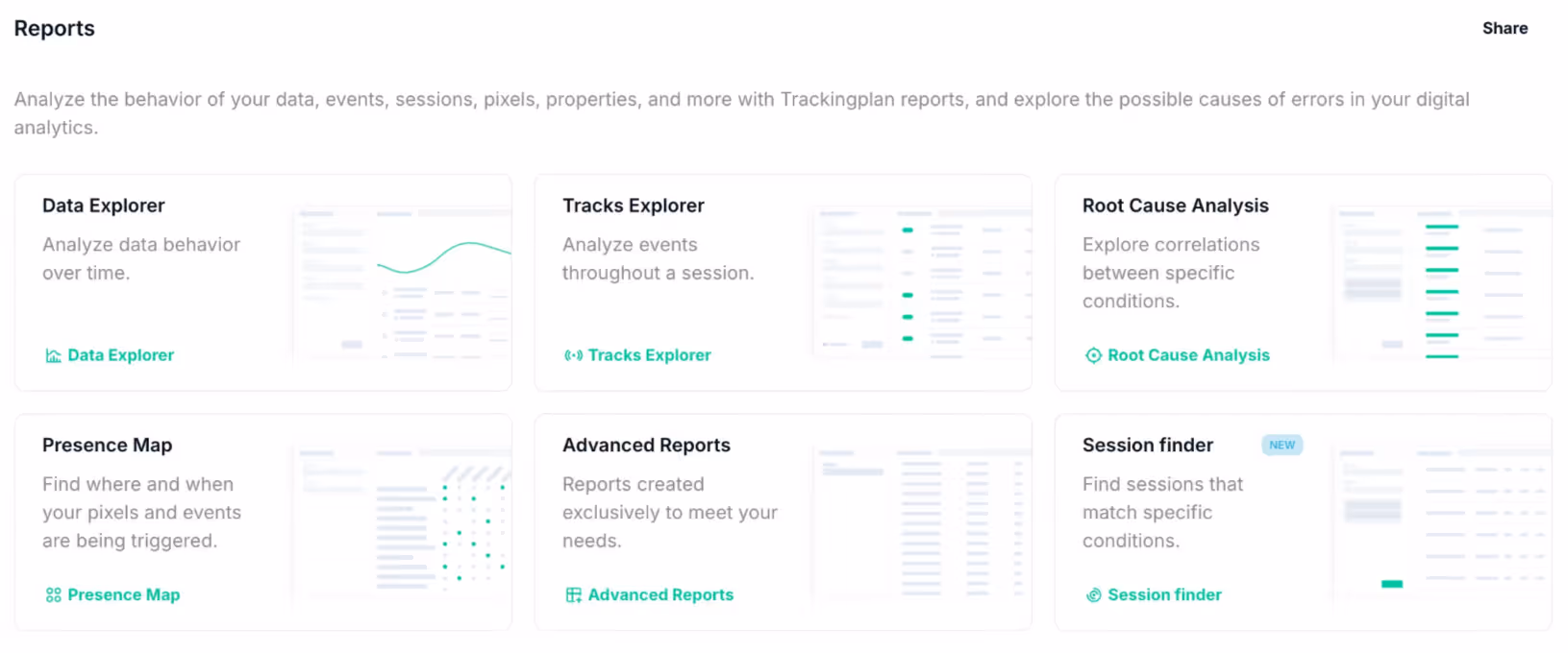 You’ll find the Reports page in the sidebar of your Trackingplan dashboard. Use it as a launchpad to dig deeper into your data — no matter where the issue hides.
