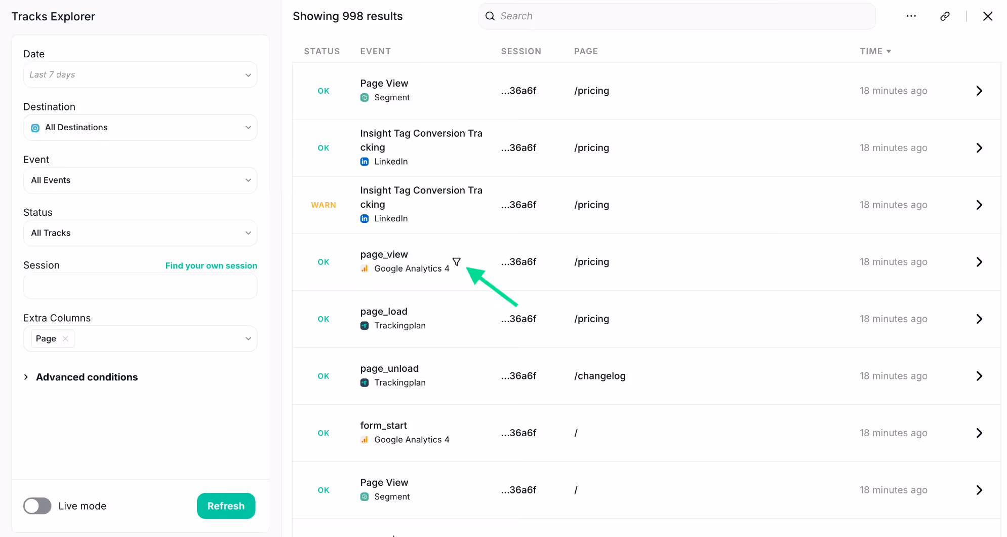 - Refine Further with Ease: After applying an initial filter, you can continue refining your search with even more specific conditions. For instance, if you want to see only page views from the “pricing” page, just select the page and filter further.