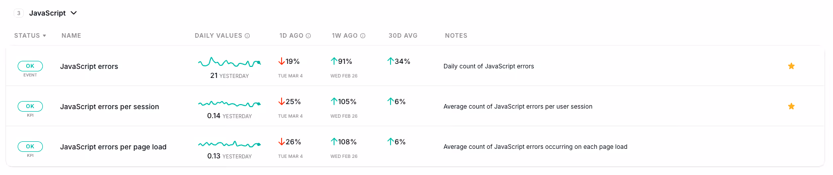 With this new feature, you can track essential JavaScript error metrics, helping you understand their impact and take immediate action: