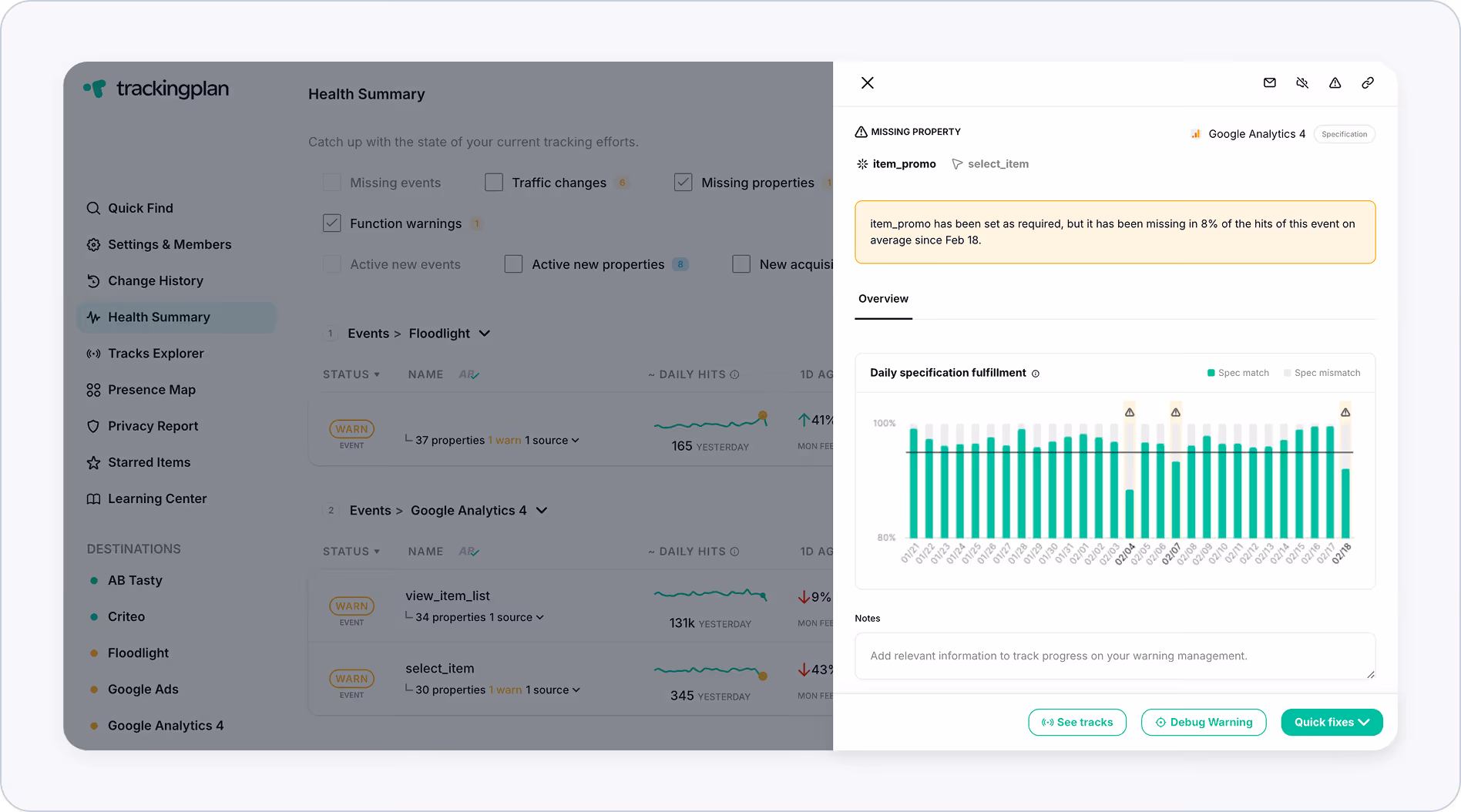 For it, Trackingplan’s Health Summary allows Pablo to quickly assess the overall state of the client’s analytics. If an issue arises, he can immediately pinpoint the exact event, URL, or pixel affected and dive deeper into the investigation, allowing him to work in reverse—first spotting potential errors and then deciding where to focus his time, rather than blindly looking for issues across multiple tools.