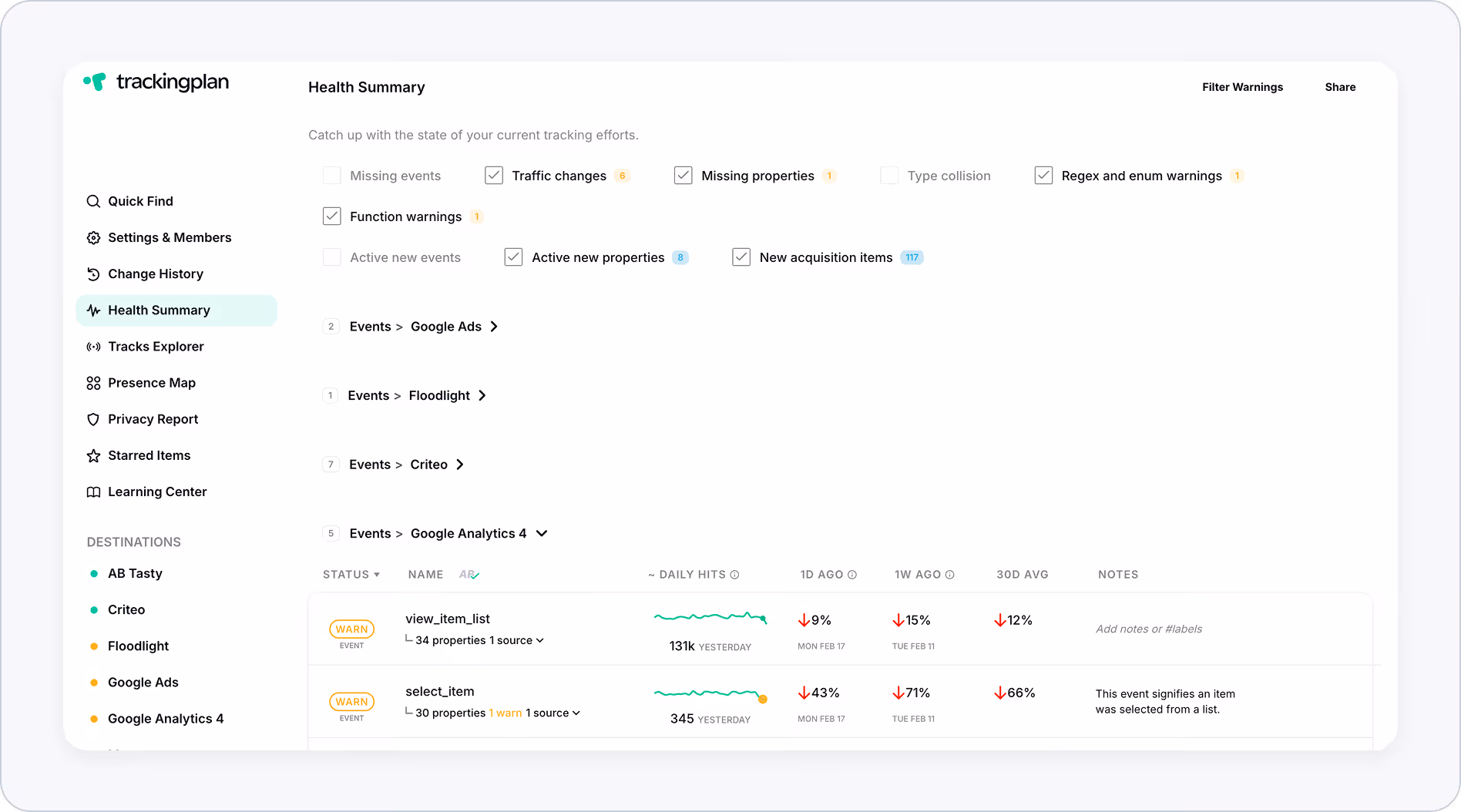 Moreover, beyond Trackingplan’s Health Summary, the ability to compare daily vs. weekly metrics and track starred items (such as key events like purchase or add_to_cart) makes it easier for him to monitor fluctuations.