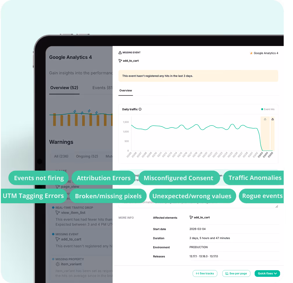 Automated observability across tags, pixels, events, consent, and attribution — all in one place.